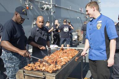 Keywords: USS Bonhomme Richard Fourth of July 'steel beach' picnic 150704-N-AY934-087.jpg en 150704-N-AY934-087 INDIAN OCEAN July 4 2015 Sailors prepare barbecue chicken for the Fourth of July steel beach picnic on the flight deck of the forward-deployed amphibious assault ship USS Bonhomme Richard LHD 6 Bonhomme Richard is the lead ship of the Bonhomme Richard Expeditionary Strike Group and is on patrol in the U S 7th Fleet area of operations U S Navy photo by Mass Communication Specialist 2nd Class Naomi VanDuser/ Released Unit USS Bonhomme Richard LHD 6 DVIDS Tags USS Bonhomme Richard; U S Navy; Independence Day; Fourth Of July; DVIDS Frontpage 2015-07-04 Petty Officer 3rd Class Naomi VanDuser https //www dvidshub net/image/2044251/uss-bonhomme-richard-fourth-july-steel-beach-picnic 150704-N-AY934-087 2015-07-04 11 03 USS BONHOMME RICHARD INDIAN OCEAN PD-USGov-Military-Navy USS Bonhomme Richard LHD-6 Images from DoD uploaded by FĂŚ |