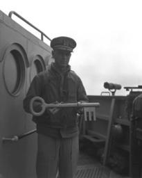 | Keywords: USS Brinkley Bass (DD-887) Wonsan 1953.jpeg U S Navy Commander G Gemmill captain of the Gearing-class destroyer USS Brinkley Bass DD-887 holds a huge key which was turned over to each relieving destroyer unit commander who temporarily became Mayor of Wonsan Korea on 24 June 1953 U S DefenseImagery http //www defenseimagery mil photo VIRIN HN-SN-98-07247; U S National Archives http //www archives gov/ file no 80-G-483746 1953-06-24 USN Korean War PD-USGov-Military-Navy Wonsan USS Brinkley Bass DD-887 |