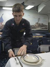 Keywords: USS Carl Vinson 140920-N-KB426-010.jpg en Culinary Specialist 1st Class Marco A Coll-Dimayo from Rockford Ill sets a table in remembrance of U S prisoners of war and missing in action personnel on the mess decks of the Arleigh Burke-class guided-missile destroyer USS Dewey Dewey is underway as part of the Carl Vinson Carrier Strike Group Carl Vinson and its embarked air wing Carrier Air Wing 17 are on deployment in the U S 7th Fleet area of operations supporting Valiant Shield Valiant Shield is a U S -only biennial exercise in which participation will focus on the integration of joint training among U S forces 2014-09-20 POW/MIA https //www dvidshub net/image/1560307 140920-N-KB426-010 2014-09-22 13 56 USS CARL VINSON AT SEA PD-USGov-Military-Navy USS Carl Vinson CVN-70 Images from DoD uploaded by Fæ |