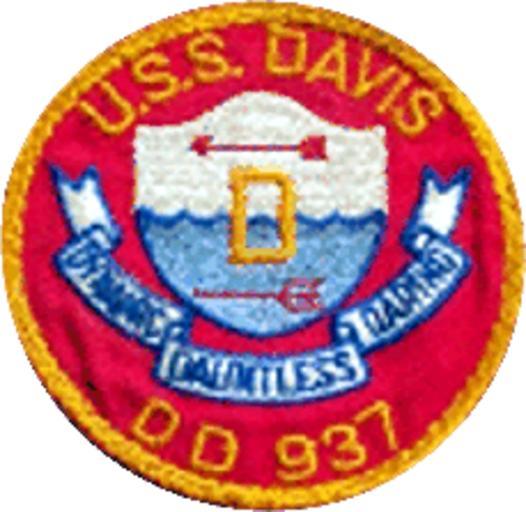 | Keywords: USS Davis (DD-937) earlier patch 1957.png Patch of the U S Navy destroyer USS Davis DD-937 from 1957 to 1970 The original insignia consists of a plain D on a shield with a background of ocean and sky the missile most likely signifying the anti-aircraft mission of the ship and the trident the anti-submarine aspect with the ship's alliterative motto Dynamic Dauntless and Daring on a banner below the shield The U S S DAVIS and DD 937 complete the insignia surrounded by mooring line a motif most likely drawn from the U S Navy seal Official U S Navy photo http //www history navy mil/danfs/d2/davis_patch1 gif from the http //www history navy mil/danfs/d2/davis-iv htm ship's entry in the U S Navy http //www history navy mil/DANFS/ Dictionary of American Naval Fighting Ships DANFS available at the http //www history navy mil Naval History and Heritage Command 1970 USN PD-USGov-Military-Navy PD-USGov-Military-Badge see at this http //www history navy mil/branches/org11-2 htm site all Pictures in the Online Library of Naval Historical Center are public domain USS Davis DD-937 United States Navy destroyer emblems |