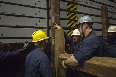 Keywords: USS Denver operations 140425-N-ZU025-029.jpg en Sailors construct wood shoring to hold Landing Craft Unit 1666 in place during transport in the well deck of the amphibious transport dock ship USS Denver Denver is part of the Bonhomme Richard Amphibious Ready Group and is conducting joint force amphibious operations in the U S 7th Fleet area of operations with the 31st Marine Expeditionary Unit and Commander Amphibious Squadron 11 2014-04-25 LCU https //www dvidshub net/image/1279420 140425-N-ZU025-029 2014-04-27 19 22 USS DENVER AT SEA PD-USGov-Military-Navy 31st Marine Expeditionary Unit Images from DoD uploaded by Fæ |