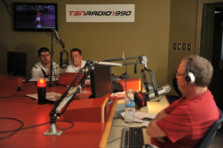 Keywords: USS DeWert (FFG 45), USS Hurricane (PC 3) and HMCS Ville de Quebec (FFH 332) visit cities in America, Canada 120731-N-YZ751-366.jpg en Operations Specialist 3rd Class Zach Wood left and Electronics Technician 2nd Class John Cochran both from Oliver Hazard Perry-class frigate USS DeWert FFG 45 answer questions from Ted Bird on TSN Radio 990 Montreal about the ship's visit to the city DeWert Cyclone-class coastal patrol ship USS Hurricane PC 3 and Canadian Halifax-class frigate HMCS Ville de Quebec FFH 332 are visiting cities in America and Canada to commemorate the Bicentennial of the War of 1812 U S Navy photo by Mass Communication Specialist 2nd Class Tony D Curtis 2012-07-31 Canadian Forces CPO 2 Anthony Curtis https //www dvidshub net/image/639129 120731-N-YZ751-366 2012-08-03 23 03 MONTREAL CA PD-USGov-Military-Navy USS De Wert FFG-45 USS Hurricane PC-3 Images from DoD uploaded by Fæ |