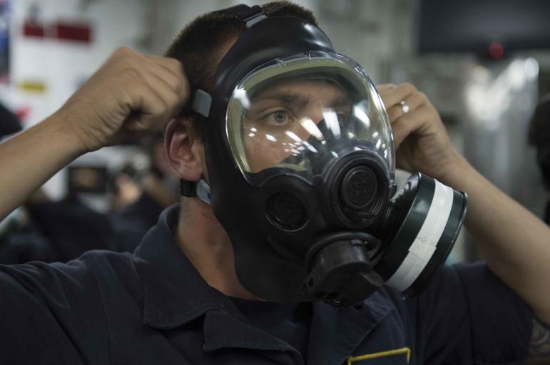| Keywords: USS Dewey general quarters drill 141017-N-KB426-159.jpg  en Seaman Charles E Ermel from Pryor Okla dons a gas mask during a chemical biological radiological general quarters drill aboard the Arleigh Burke-class guided-missile destroyer USS Dewey Dewey is deployed in the U S 5th Fleet area of operations supporting Operation Inherent Resolve strike operations in Iraq and Syria as directed maritime security operations and theater security cooperation efforts in the region 2014-10-17 DDG 105 https //www dvidshub net/image/1626567 141017-N-KB426-159 2014-10-23 18 18 USS DEWEY AT SEA PD-USGov-Military-Navy MCU-2/P Protective Mask Images from DoD uploaded by Fæ Males wearing gas masks |