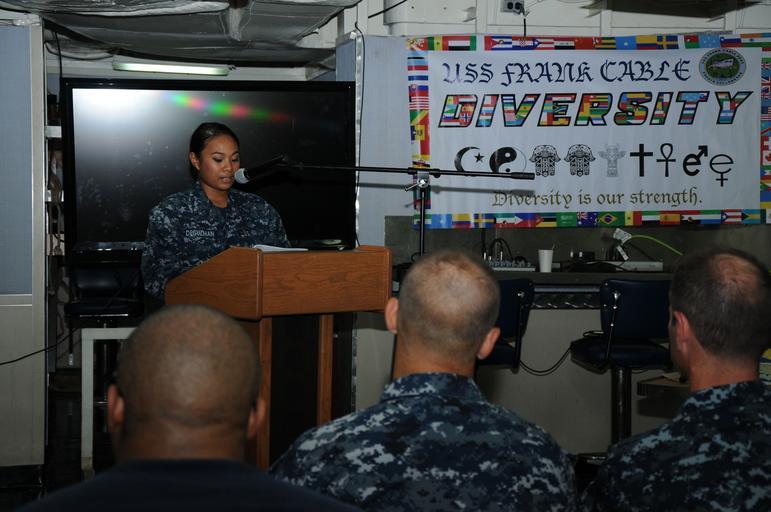 Keywords: USS Frank Cable operations 150828-N-DA434-007.jpg en 150828-N-DA434-007 POLARIS POINT Boatswain ™s Mate Seaman Faustina Deguzman a Sailor stationed aboard the submarine tender USS Frank Cable discusses Women ™s Equality during a ceremony held onboard honoring Women's Equality Day Aug 26 Frank Cable forward deployed to the island of Guam conducts maintenance and support to submarines and surface vessels deployed in the U S 7th Fleet area of responsibility 2015-08-28 Aug 28 2015 https //www dvidshub net/image/2160671 150828-N-DA434-007 2015-09-05 00 05 USS FRANK CABLE GU 3 PD-USGov-Military-Navy USS Frank Cable AS-40 Images from DoD uploaded by Fæ |
