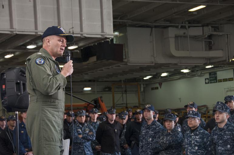 Keywords: USS George Washington 141231-N-YD641-037.jpg en Capt Greg Fenton commanding officer of the Nimitz-class aircraft carrier USS George Washington speaks to the crew during an all-hands call in the ship's hangar bay George Washington and its embarked air wing Carrier Air Wing 5 provide a combat-ready force that protects and defends the collective maritime interests of the U S and its allies and partners in the Indo-Asia-Pacific region 2014-12-31 CVN 73 https //www dvidshub net/image/1711686 141231-N-YD641-037 2014-12-31 10 18 YOKOSUKA JP PD-USGov-Military-Navy USS George Washington CVN-73 Images from DoD uploaded by Fæ Gregory J Fenton |