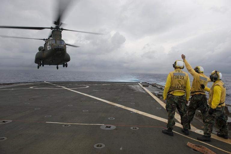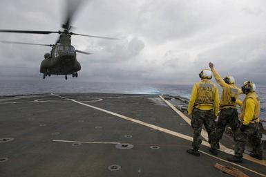 Keywords: USS Germantown operations 141111-N-UD469-117.jpg en Sailors signal to a CH-47 Chinook helicopter assigned to the Japanese Ground Self Defense Force JGSDF as it lands on the flight deck of the amphibious dock landing ship USS Germantown LSD 42 during a personnel transfer for exercise Keen Sword Exercise Keen Sword is a bilateral field training exercise held biennially since 1986 The exercise is designed to increase the interoperability of U S Forces and the Japanese Self Defense Forces JSDF to effectively and mutually provide for the defense of Japan or respond to a regional crisis or contingency situation in the Asia-Pacific region Germantown is part of the Peleliu Amphibious Ready Group PELARG14 commanded by Capt Heidi Agle and is conducting joint forces exercises in the U S 7th Fleet area of responsibility U S Navy Photo by Mass Communication Specialist 2nd Class Amanda R Gray/Released 2014-11-11 Petty Officer 2nd Class Amanda Gray https //www dvidshub net/image/1658832 141111-N-UD469-117 2014-11-15 02 44 BUCKNER BAY USAFRICOM AT SEA PD-USGov-Military-Navy Kawasaki CH-47 USS Germantown LSD-42 Images from DoD uploaded by Fæ |