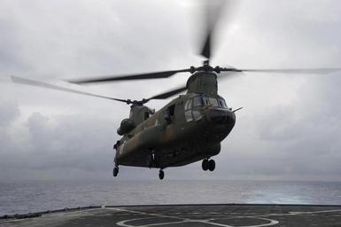 Keywords: USS Germantown operations 141111-N-UD469-162.jpg en A CH-47 Chinook helicopter assigned to the Japanese Ground Self Defense Force JGSDF takes off from the flight deck of the amphibious dock landing ship USS Germantown LSD 42 following a personnel transfer for exercise Keen Sword Exercise Keen Sword is a bilateral field training exercise held biennially since 1986 The exercise is designed to increase the interoperability of U S Forces and the Japanese Self Defense Forces JSDF to effectively and mutually provide for the defense of Japan or respond to a regional crisis or contingency situation in the Asia-Pacific region Germantown is part of the Peleliu Amphibious Ready Group PELARG14 commanded by Capt Heidi Agle and is conducting joint forces exercises in the U S 7th Fleet area of responsibility U S Navy Photo by Mass Communication Specialist 2nd Class Amanda R Gray/Released 2014-11-11 Petty Officer 2nd Class Amanda Gray https //www dvidshub net/image/1658834 141111-N-UD469-162 2014-11-15 02 44 BUCKNER BAY USAFRICOM AT SEA PD-USGov-Military-Navy Kawasaki CH-47 USS Germantown LSD-42 Images from DoD uploaded by Fæ |