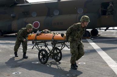 | Keywords: USS Germantown operations 141112-N-UD469-232.jpg en Members of the Japanese Ground Self Defense Force JGSDF carry a simulated injured patient from a JGSDF CH-47 Chinook to the medical ward of the amphibious dock landing ship USS Germantown LSD 42 during a Medical Evacuation MEDEVAC drill for exercise Keen Sword Exercise Keen Sword is a bilateral field training exercise held biennially since 1986 The exercise is designed to increase the interoperability of U S Forces and the Japanese Self Defense Forces JSDF to effectively and mutually provide for the defense of Japan or respond to a regional crisis or contingency situation in the Asia-Pacific region Germantown is part of the Peleliu Amphibious Ready Group PELARG14 commanded by Capt Heidi Agle and is conducting joint forces exercises in the U S 7th Fleet area of responsibility U S Navy Photo by Mass Communication Specialist 2nd Class Amanda R Gray/Released 2014-11-12 Petty Officer 2nd Class Amanda Gray https //www dvidshub net/image/1658846 141112-N-UD469-232 2014-11-15 02 44 PHILIPPINE SEA PD-USGov-Military-Navy Kawasaki CH-47 USS Germantown LSD-42 Images from DoD uploaded by Fæ |