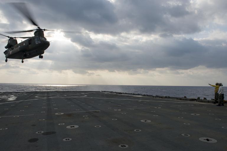 Keywords: USS Germantown operations 141112-N-UD469-006.jpg en Sailors signal to a CH-47 Chinook assigned to the Japanese Ground Self Defense Force JGSDF as it lands on the flight deck of the amphibious dock landing ship USS Germantown LSD 42 during a personnel transfer for exercise Keen Sword Exercise Keen Sword is a bilateral field training exercise held biennially since 1986 The exercise is designed to increase the interoperability of U S Forces and the Japanese Self Defense Forces JSDF to effectively and mutually provide for the defense of Japan or respond to a regional crisis or contingency situation in the Asia-Pacific region Germantown is part of the Peleliu Amphibious Ready Group PELARG14 commanded by Capt Heidi Agle and is conducting joint forces exercises in the U S 7th Fleet area of responsibility U S Navy Photo by Mass Communication Specialist 2nd Class Amanda R Gray/Released 2014-11-11 Petty Officer 2nd Class Amanda Gray https //www dvidshub net/image/1658836 141112-N-UD469-006 2014-11-15 02 44 PHILIPPINE SEA PD-USGov-Military-Navy Kawasaki CH-47 USS Germantown LSD-42 Images from DoD uploaded by Fæ |