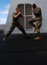 Keywords: USS Green Bay action 121004-N-BB534-208.jpg en Cpl Jason Matney left and Sgt Nathaniel McDonald right spar during a martial arts training session aboard amphibious transport dock ship USS Green Bay LPD 20 Green Bay is part of the Peleliu Amphibious Ready Group currently underway on a deployment with amphibious assault ship USS Peleliu LHA 5 and amphibious dock landing ship USS Rushmore LSD 47 U S Navy Photo by Mass Communication Specialist 1st Class SW/AW Elizabeth Merriam 2012-10-04 Petty Officer 2nd Class Elizabeth Merriam https //www dvidshub net/image/678003 121004-N-BB534-208 2012-10-08 05 09 PACIFIC OCEAN PD-USGov-Military-Navy USS Peleliu LHA-5 USS Green Bay LPD-20 USS Peleliu LHA-5 USS Rushmore LSD-47 Images from DoD uploaded by Fæ |