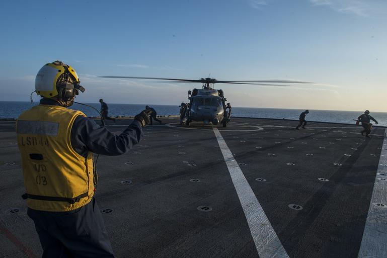 Keywords: USS Gunston Hall 140428-N-XJ695-394.jpg en U S Navy Boatswain's Mate 1st Class Ronnie Davis left directs the flight deck crew to remove chocks and chains from an Air Force HH-60G Pave Hawk helicopter as part of deck landing qualifications aboard the amphibious dock landing ship USS Gunston Hall in the Gulf of Aden April 28 2014 The Gunston Hall deployed as part of the Bataan Amphibious Ready Group with the embarked 22nd Marine Expeditionary Unit in support of maritime security operations and theater security cooperation efforts in the U S 5th Fleet area of responsibility 2014-04-28 LSD 44 https //www dvidshub net/image/1312975 140428-N-XJ695-394 2014-05-03 10 02 USS GUNSTON HALL LSD 44 AT SEA PD-USGov-Military-Navy USS Gunston Hall LSD-44 22nd Marine Expeditionary Unit Images from DoD uploaded by Fæ