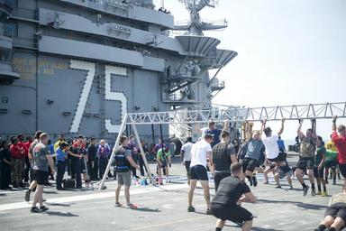 | Keywords: USS Harry S. Truman activity 150525-N-MU551-169.jpg en 150525-N-MU551-169 ATLANTIC OCEAN May 25 2015 Sailors participate in Murph a workout in honor of the late Lt Michael Murphy on the flight deck of aircraft carrier USS Harry S Truman CVN 75 on Memorial Day The workout consists of 100 pullups 200 pushups 300 squats and a two-mile run Truman is currently conducting sea trials an at-sea shipboard testing of systems and equipment following a successful condensed incremental maintenance period U S Navy photo by Mass Communication Specialist Seaman M M Gillan/Released Unit Navy Media Content Services DVIDS Tags NMCS; DVIDS Bulk Import 2015-05-25 Mason M Gillan https //www dvidshub net/image/2064347/uss-harry-s-truman-activity 150525-N-MU551-169 2015-07-17 17 00 USS HARRY S TRUMAN ATLANTIC OCEAN PD-USGov-Military-Navy Push-ups USS Harry S Truman CVN-75 Images from DoD uploaded by Fæ |