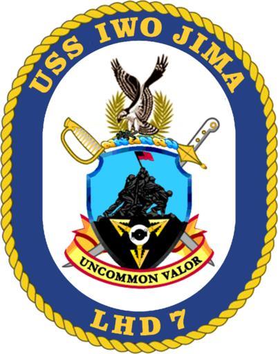| Keywords: USS Iwo Jima COA.png en Emblem of the USS Iwo Jima LHD-7 2011-06-08 United States Army Institute of Heraldry Member of the Armed Forces of the United States PD-USGov Seal The coat of arms emblazoned upon a white oval enclosed by a blue collar edged on the outside with gold rope and inscribed USS IWO JIMA above and LHD 7 below in gold Shield Iwo Jima was the site of one of the most important and bitterly fought amphibious operations of World War II The United States Marine Corps War Memorial is based on the Immortal photograph of the flag raising on Mount Suribachi on February 23rd 1945 and has become a symbol of strength courage and valor The three spearheads represent the amphibious triad The Landing Craft Air Cushion LCAC The Amphibious Assault Vehicle AAV and the V-22 Osprey Tilt Rotor Aircraft The light blue reflects the seas of the world The USS IWO JIMA LHD 7 one of the last ships propelled by steam boilers is reflected by the white disc with the Hero's boiler Crest The USS IWO JIMA LHD 7 is configured to deploy with the V-22 Osprey Tilt Rotor Aircraft This is symbolized by the attacking Osprey The previous USS IWO JIMA LPH 2 was a helo-carrier during the Vietnam Era The palm fronds commemorate the previous ship and its service in Vietnam Motto The motto is based on Fleet Admiral Chester W Nimitz's words when he spoke of the Sailors and Marines who fought at the battle of Iwo Jima Among the Americans who fought at Iwo Jima uncommon valor was a common virtue The red is emblematic of valor and sacrifice Supporters The crossed swords highlight cooperation and unity that typify the U S Navy and Marine Corps Blue-Green Team Uploaded with UploadWizard United States Navy landing ships emblems LHD-7 Aboard USS Iwo Jima LHD-7 Amphibious assault ships of the United States |