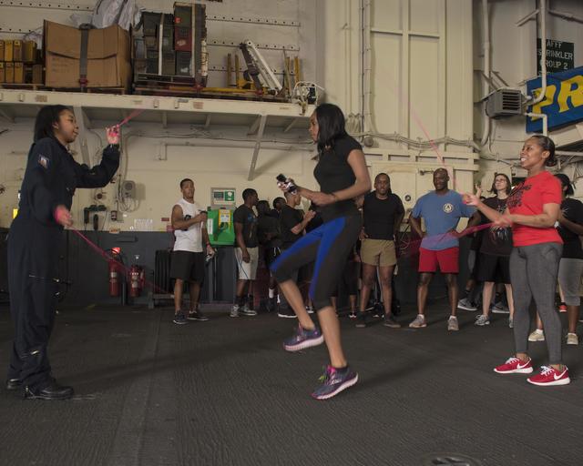 Keywords: USS Kearsarge activity 160130-N-TT202-315.jpg en 160130-N-TT202-315 GULF OF OMAN Sailors jump rope in the hangar-bay during a steel-beach picnic aboard the amphibious assault ship USS Kearsarge Kearsarge is the flagship for the Kearsarge Amphibious Ready Group and with the embarked 26th Marine Expeditionary Unit is deployed in support of maritime security operations and theater security cooperation efforts in the U S 5th Fleet area of operations <br>Unit USS Kearsarge LHD 3 2016-01-30 Jan 30 2016 https //www dvidshub net/image/2381014/uss-kearsarge-activity 160130-N-TT202-315 2016-02-03 10 07 USS KEARSARGE GULF OF OMAN PD-USGov-Military-Navy 26th Marine Expeditionary Unit Images from DoD uploaded by Fæ |