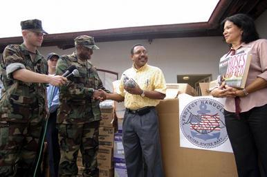 Keywords: USS Kearsarge Continuing Promise 08 DVIDS124471.jpg en Capt Walter Towns the commanding officer of the amphibious assault ship USS Kearsarge shakes hands with Angelo Ramirez chairman of the Netherlands Antilles Red Cross after unloading a truck with donations from Project Hand Clasp to the Suffisantweg Red Cross Center as part of a the humanitarian service project Continuing Promise 08 Kearsarge is supporting the Caribbean phase of CP an equal-partnership mission between the United States Canada the Netherlands Brazil Nicaragua Colombia Dominican Republic Trinidad and Tobago and Guyana 2008-10-21 Petty Officer 2nd Class Erik Barker https //www dvidshub net/image/124471 081021-N-+++++-008 2008-10-25 15 33 WILLEMSTAD CW PD-USGov-Military-Navy USS Kearsarge LHD-3 Images from DoD uploaded by Fæ |