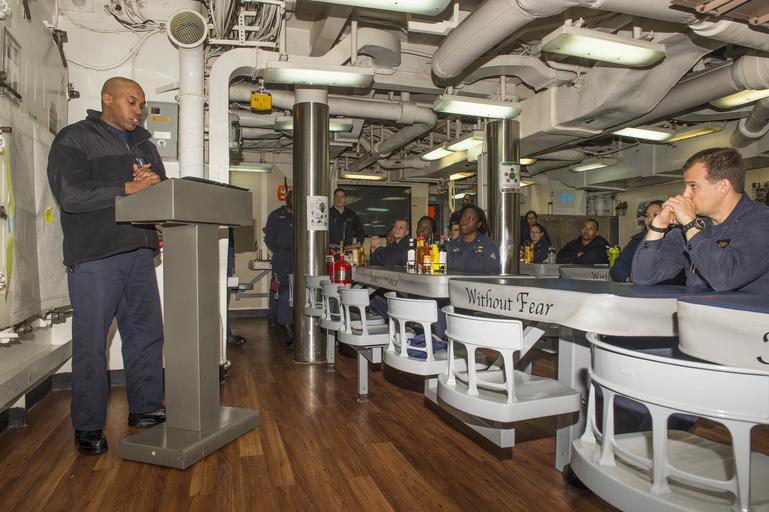 Keywords: USS Laboon Black History Month Celebration 150219-N-XB010-009.jpg en 150219-N-XB010-009 ATLANTIC OCEAN Lt j g Marquis Jones USS Laboon command chaplain speaks about Dr Martin Luther King Jr during a Black History Month Celebration aboard ship Feb 19 2015 Laboon an Arleigh Burke-class guided-missile destroyer home ported in Norfolk is underway conducting naval operations in the U S 6th Fleet area of operations in support of U S national security interests in Europe 2015-02-19 Feb 19 2015 https //www dvidshub net/image/1778821 150219-N-XB010-009 2015-02-20 13 47 USS LABOON ATLANTIC OCEAN AT SEA PD-USGov-Military-Navy Black History Month Images from DoD uploaded by Fæ |
