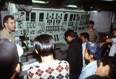 Keywords: USS Lake Champlain (CG-57) engineering tour.jpg Engineering officers aboard the guided missile cruiser USS LAKE CHAMPLAIN CG-57 answer questions from Hispanic students of the Orange Glen and Escondido High School junior Reserve Officers Training Candidate ROTC program during a tour of the engineering spaces of the ship Location SAN DIEGO CALIFORNIA CA UNITED STATES OF AMERICA USA http //www dodmedia osd mil/Assets/Still/1994/Navy/DN-ST-94-02149 JPEG ID DN-ST-94-02149 / Service Depicted Navy Date Shot 1 Oct 1993 Camera Operator PH1 CHARLES W ALLEY PD-USGov-Military-Navy Aboard USS Lake Champlain CG-57 Reserve Officers' Training Corps ROTC |