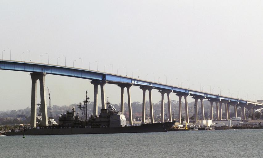 Keywords: USS Lake Champlain (CG-57) passes under the Coronado Bay Bridge.jpg US Navy USN Sailors aboard the USN Ticonderoga Class Guided Missile Cruiser Aegis USS LAKE CHAMPLAIN CG 57 man the rails as their ship passes under the Coronado Bay Bridge during its returns to its homeport at Naval Base NS San Diego California LAKE CHAMPLAIN completed a regular scheduled deployment in support of the Global War on Terrorism GWOT and Maritime Security Operations MSO Location NAVAL STATION SAN DIEGO CALIFORNIA CA UNITED STATES OF AMERICA USA http //www dodmedia osd mil/Assets/Still/2007/Navy/DN-SD-07-07700 JPEG ID DN-SD-07-07700 / Service Depicted Navy / 060706-N-5617R-038 Date Shot 1 Jan 2002 Camera Operator MCSA RIALYN C RODRIGO USN USS Lake Champlain CG-57 PD-USGov-Military-Navy Naval ship arrivals to Naval Base San Diego Manning the rail in the United States Navy San Diego-Coronado Bridge |