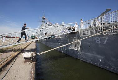 Keywords: USS Mason action 130805-N-PW661-008.jpg en Adam H Sterling left the Charge d'Affaires at the U S Embassy in Amsterdam boards the guided missile destroyer USS Mason DDG 87 for a reception Aug 5 2013 in Amsterdam The Mason was on a port visit to the city while deployed as part of the Harry S Truman Carrier Strike Group in support of maritime security operations and theater security cooperation efforts in the U S 6th Fleet area of responsibility U S Navy photo by Mass Communication Specialist 2nd Class Rob Aylward/Released 2013-08-05 Petty Officer 3rd Class Rob Aylward https //www dvidshub net/image/1019913 130805-N-PW661-008 2013-09-17 05 45 AMSTERDAM NL PD-USGov-Military-Navy USS Mason DDG-87 Images from DoD uploaded by Fæ |