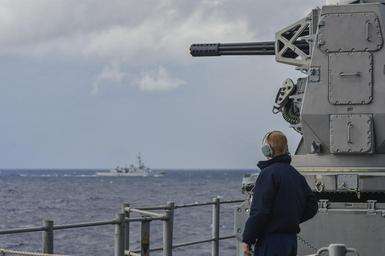 Keywords: USS Monterey operations 131205-N-QL471-519.jpg en U S Navy Fire Controlman 3rd Class Levi Wood stands on deck aboard the guided missile cruiser USS Monterey CG 61 as the French navy anti-submarine frigate Jean de Vienne D 643 sails nearby during a live-fire exercise Dec 5 2013 in the Mediterranean Sea The Monterey was deployed in support of maritime security operations and theater security cooperation efforts in the U S 6th Fleet area of responsibility U S Navy photo by Mass Communication Specialist 2nd Class Billy Ho/Released <br>Unit Defense Imagery Management Operations Center 2013-12-05 Billy Ho https //www dvidshub net/image/1142994/uss-monterey-operations 131205-N-QL471-519 2013-12-21 00 19 USS MONTEREY CG 61 AT SEA PD-USGov-Military-Navy USS Monterey CG-61 Images from DoD uploaded by Fæ |