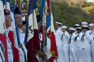 Keywords: USS Mount Whitney in Theoule-sur-Mer, France 120814-N-PE825-165.jpg en Sailors from USS Mount Whitney LCC 20 stand in formation at the Cross of Lorraine monument as French army veterans bear flags commemorating the Liberation of Provence by allied forces during World War II Mount Whitney homeported in Gaeta Italy is the U S 6th Fleet flagship and operates with a combined crew of U S sailors and MSC civil service mariners The civil service mariners perform navigation deck engineering laundry and galley service operations while military personnel aboard support communications weapons systems and security U S Navy photo by Mass Communication Specialist 2nd Class Collin Turner/Released 2012-08-14 Petty Officer 1st Class Collin Turner https //www dvidshub net/image/645802 120814-N-PE825-165 2012-08-15 09 16 THEOULE-SUR-MER FR PD-USGov-Military-Navy USS Mount Whitney LCC-20 Images from DoD uploaded by Fæ |