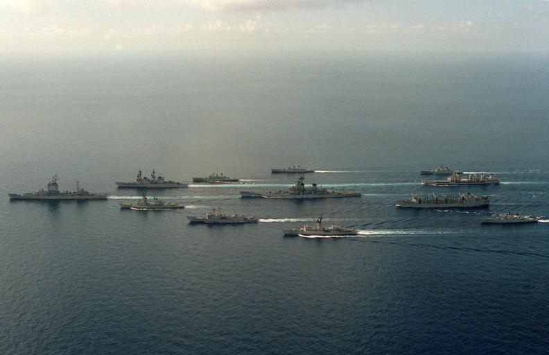 | Keywords: USS New Jersey (BB-62) battle group with Australian ships 1986.JPEG An aerial view of the first U S Navy battleship battle group to deploy to the Western Pacific since the Korean War underway with Australian ships during a training exercise The ships are clockwise from left USS Long Beach CGN-9 USS Merrill DD-976 HMAS Swan DE 50 HMAS Stuart DE 48 HMAS Parramatta DE 46 USNS Passumpsic T-AO-107 USS Wabash AOR-5 HMAS Derwent DE 49 USS Kirk FF-1087 USS Thach FFG-43 HMAS Hobart D 39 and USS New Jersey BB-62 center http //www defenseimagery mil U S DefenseImagery photo VIRIN http //www defenseimagery mil/imagery html guid c26e46330bf9c6dff900992310576ac36e395a16 DN-SC-87-00354 1986-07-01 PH2 Orell USN PD-USGov-Military-Navy USS New Jersey BB-62 USS Long Beach CGN-9 USS Wabash AOR-5 USS Thach FFG-43 USS Merrill DD-976 USS Passumpsic AO-107 USS Kirk FF-1087 ship 1971 HMAS Hobart D 39 HMAS Derwent DE 49 River class destroyer escort of the Royal Australian Navy International groups of naval ships |