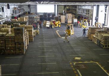 Keywords: USS Peleliu loading ordnance at sea 140826-N-EH218-026.jpg en Sailors on board amphibious assault ship USS Peleliu and civilians from Naval Munitions Command Detachment Sasebo transport ordnance inside the hangar bay during a three-day ammo on load evolution prior to embarking the 31st Marine Expeditionary Unit Peleliu is on its final regularly scheduled Western Pacific deployment in the U S 7th Fleet area of responsibility supporting security and stability in the Indo-Asia-Pacific region before decommissioning early next year 2014-08-26 LHA 5 https //www dvidshub net/image/1529942 140826-N-EH218-026 2014-08-31 13 50 SASEBO JP PD-USGov-Military-Navy 31st Marine Expeditionary Unit USS Peleliu LHA-5 Images from DoD uploaded by Fæ |