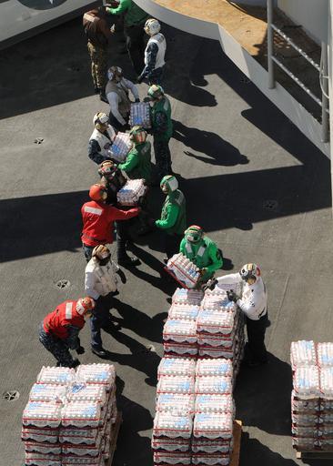 Keywords: USS Ronald Reagan Action DVIDS338446.jpg en Sailors assigned to the aircraft carrier USS Ronald Reagan and embarked Carrier Air Wing 14 unload cases of water off of a C-2A Greyhound from Fleet Logistics Combat Support Squadron 30 Ronald Reagan was diverted from its current training maneuvers at the direction of Commander U S Third Fleet and at the request of the U S Coast Guard to a position south near the Carnival cruise ship C/V Splendor to facilitate the delivery of 4 500 pounds of supplies to the cruise ship Early Monday CV Splendor reported it was dead in the water 150 nautical miles southwest of San Diego 2010-11-09 CVN 76 https //www dvidshub net/image/338446 101109-N-+++++-286 2010-11-10 05 57 ABOARD USS RONALD REAGAN AT SEA PD-USGov-Military-Navy Grumman C-2 Greyhound Bottled water Images from DoD uploaded by Fæ 2010 Carnival Splendor fire and relief efforts