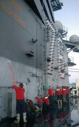 Keywords: USS Ronald Reagan action DVIDS340317.jpg en Sailors aboard the aircraft carrier USS Ronald Reagan scrub down the island during a scrub exercise A SCRUBEX is necessary to clean salt water spray off the skin of the ship to prevent corrosion Ronald Reagan is currently underway preparing for upcoming deployment 2010-11-14 U S Navy photo by Petty Officer 3rd Class Erin L Oberholtzer https //www dvidshub net/image/340317 101114-N-+++++-334 2010-11-15 21 41 USS RONALD REAGAN AT SEA PD-USGov-Military-Navy USS Ronald Reagan CVN-76 Images from DoD uploaded by Fæ |