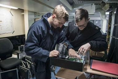 Keywords: USS Ronald Reagan action 151113-N-IN729-010.jpg en 151113-N-IN729-010 PHILIPPINE SEA Nov 13 2015 Information Systems Technician 2nd Class Logan Ison from Freedom Wis and Information Systems Technician 2nd Class Wesley Lafountain from Naples Italy perform maintenance on a computer hard drive in the server room aboard the U S Navy's only forward-deployed aircraft carrier USS Ronald Reagan CVN 76 Ronald Reagan and its embarked air wing Carrier Air Wing CVW 5 provide a combat-ready force that protects and defends the collective maritime interests of the U S and its allies and partners in the Indo-Asia-Pacific region U S Navy photo by Mass Communication Specialist 3rd Class Ryan McFarlane/Released 2015-11-13 Seaman Ryan McFarlane https //www dvidshub net/image/2293033 151113-N-IN729-010 2015-11-18 00 15 USS RONALD REAGAN CVN 76 PHILIPPINE SEA 3 PD-USGov-Military-Navy USS Ronald Reagan CVN-76 Images from DoD uploaded by Fæ |
