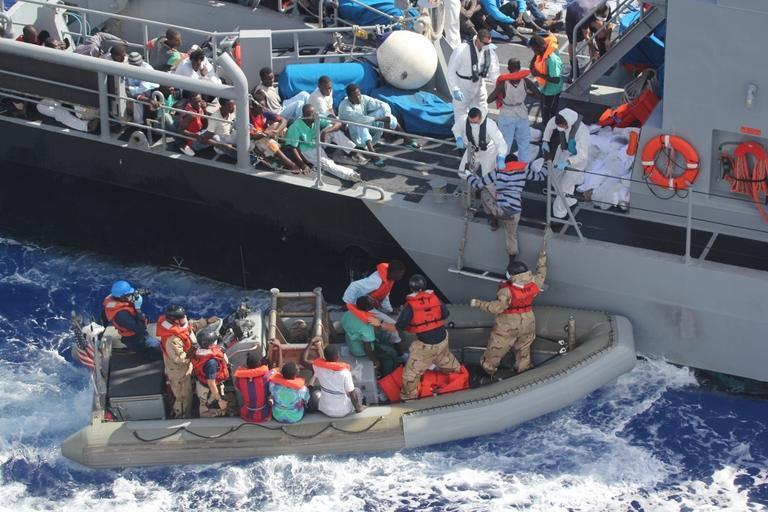 Keywords: USS San Antonio assists in rescue 131017-N-ZZ999-007.jpg en Distressed persons are transferred from the amphibious transport dock ship USS San Antonio to armed forces of Malta offshore patrol vessel P52 San Antonio provided food water medical attention and temporary shelter to the rescued San Antonio rescued 128 men adrift in an inflatable raft after responding to a call by the Maltese government 2013-10-17 LPD 17 https //www dvidshub net/image/1036388 131017-N-ZZ999-007 2013-10-17 18 49 USS SAN ANTONIO AT SEA PD-USGov-Military-Navy USS San Antonio LPD-17 Images from DoD uploaded by Fæ |