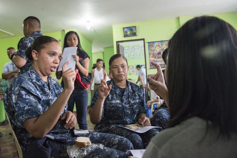 | Keywords: USS Shiloh in Olongapo City 150601-N-BB269-277.jpg  en 150601-N-BB269-277 SUBIC BAY Philippines June 1 2015 Quartermaster Seaman Alexis Walker left from Toledo Ohio and Seaman Kai M Richardson from Los Angeles Calif both assigned to the Ticonderoga-class guided-missile cruiser USS Shiloh CG 67 learn sign language from a student of the Association of Differently Abled Persons school during a community relation project in Olongapo City The school established in 1991 teaches children and teens whom are deaf mute or blind skill sets needed to communicate with others Shiloh is on patrol in the U S 7th Fleet area of operation in support of security and stability in the Indo-Asia Pacific region U S Navy photo by Mass Communication Specialist 2nd Class Raymond D Diaz III/Released 2015-06-01 Petty Officer 3rd Class Raymond Diaz III https //www dvidshub net/image/1974075 150601-N-BB269-277 2015-06-04 05 50 OLONGAPO CITY PH PD-USGov-Military-Navy USS Shiloh CG-67 Images from DoD uploaded by Fæ |