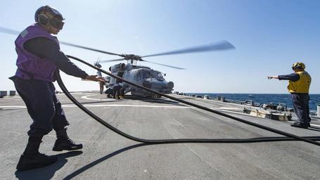 Keywords: USS STOUT (DDG 55) DEPLOYMENT 2016 160921-N-GP524-113.jpg en 160921-N-GP524-113 ARABIAN GULF Sept 21 2016 Gas Turbine System Technician Mechanical Fireman Mario Orellana left unfurls a fuel hose in preparation to refuel a MH-60R Sea Hawk helicopter assigned to the Vipers of Helicopter Maritime Strike Squadron HSM 48 aboard the guided-missile destroyer USS Stout DDG 55 Stout deployed as part of the Eisenhower Carrier Strike Group is supporting maritime security operations and theater security cooperation efforts in the U S 5th Fleet area of operations U S Navy photo by Mass Communication Specialist 3rd Class Bill Dodge Unit Navy Media Content Services DVIDS Tags SAR; Search and Rescue; formation; ocean; transit; Bahrain; RAS; USNS Pecos ; GQ; general quarters; Arleigh Burke-class; America; underway; CIWS; 6th Fleet; guided-missile destroyer; Manama ; forward deployed; Memorial Day; USS Stout DDG 55 ; ship; SUEZ CANAL; Navy; COMREL; Sailor; community relations; destroyer; replenishment-at-sea; U S Navy; 5th Fleet; deployment; MC; Stout; USS Stout; DDG 55; Lt Michael Murphy; NMCS; DVIDS Bulk Import; Mass Communication Specialist 3rd Class Bill Dodge; MC3 Bill Dodge; Murph Challenge; ARGONAUT 2016; Sailors giving back 2016-09-21 Petty Officer 3rd Class William Dodge https //www dvidshub net/image/2883780/uss-stout-ddg-55-deployment-2016 160921-N-GP524-113 2016-09-28 00 04 PERSIAN GULF PD-USGov-Military-Navy Manama USS Stout DDG-55 Images from DoD uploaded by Fæ |