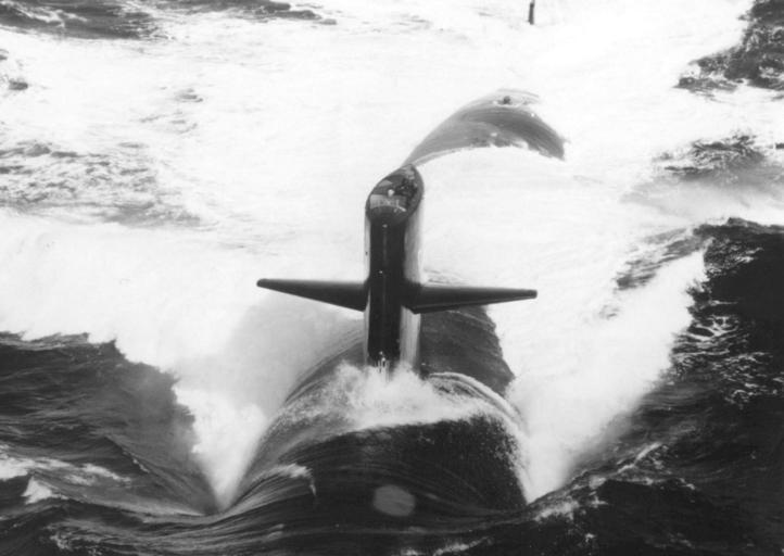 Keywords: USS Sturgeon (SSN-637).jpg en Bow view's of the Sturgeon SSN-637 on shakedown trials on 15 Feb 1967 http //www navsource org/archives/08/08637 htm USN photo NPC K-36125 1967-02-15 USS Sturgeon SSN-637 PD-USGov-Military-Navy