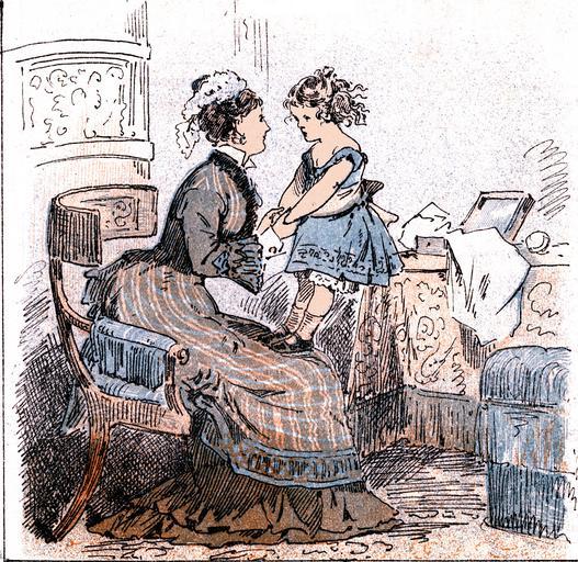 Keywords: Utaalmodighed1876.jpg da Utaalmodighed <br>- Er det ikke Jul i Aften Moder <br>- Nej min søde Pige det er først på Søndag <br>-Jamen er det da ikke Søndag i Morgen <br>- Nej ikke før i Over-overmorgen <br>- Det var kedeligt Bare det dog var Søndag hver Dag Punch the Danish side 401 anonymus 1876-12-21 PD PD-Art People in 1876 1876 in Denmark Standing women in art Punch Danish magazine Images by Haabet Standing girls in art Mothers and daughters in art Fashion in 1876 Women of Denmark in art Drawings of sitting females Caricatures of children 1876 cartoons