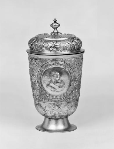 | Keywords: V D - Covered Cup - Walters 57815.jpg The sides of this cup contain medallions with a profile portrait of Elizabeth I Empress of Russia from 1741-1762 the double-headed eagle emblem of the Russian Empire and the empress's monogram EP Elizabeth Petrovna placed under a crown The mask-like foliate design in the repoussé indicates a Dutch influence The cup was made by an unknown silversmith who signed with the initials 'VD' active 1741-1753 and assayed by Egor Ivanov active 1752-1758 Cups such as this were presented to members of the empress's guard regiments 1753 Early Modern silver parcel gilt cm 15 5 accession number 57 815 23879 Alexandre Polovtsoff Aleksandr Aleksandrovich Polovtsov Saint Petersburg and Paris by purchase Henry Walters city Baltimore Walters Art Museum Henry Walters Acquired by Henry Walters 1929 Russian Art Icons and Decorative Arts from the Origin to the Twentieth Century The Walters Art Gallery Baltimore 1959-1960 place of origin Moscow Russia Walters Art Museum license Collections of the Walters Art Museum Elizabeth of Russia Profile portraits of Elizabeth of Russia 1753 in art Silver cups in art |