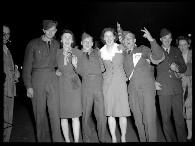 Keywords: v-e ve day may 7 1945 vancouver bc monochrome people blackandwhite black and white VE Day celebrations VPL Accession Number: 42795 Date: May 7, 1945 Photographer / Studio: Province Newspaper Content: VE Day downtown celebrations. Four servicemen and three women. One man making victory sign. Topic:V-E Day, 1945 Location: British Columbia - Vancouver - Downtown More information on our historical photograph collection: www.vpl.ca/historicalphotos VE Day celebrations VPL Accession Number: 42795 Date: May 7, 1945 Photographer / Studio: Province Newspaper Content: VE Day downtown celebrations. Four servicemen and three women. One man making victory sign. Topic:V-E Day, 1945 Location: British Columbia - Vancouver - Downtown More information on our historical photograph collection: www.vpl.ca/historicalphotos |