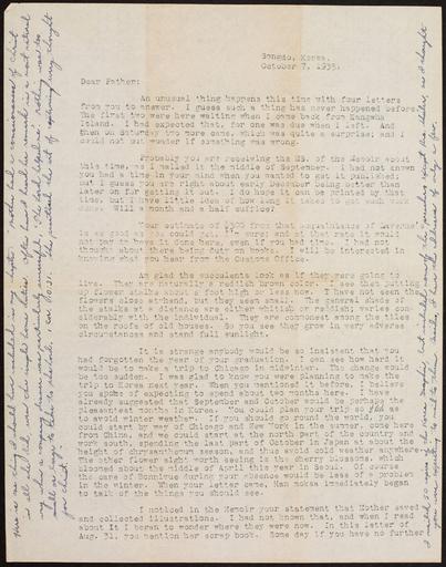 | Keywords: V.W. Peters, letter, 1935.10.7, Songdo, Korea, to Father, Rosemead, California, USA (Peters 351007~1).jpg en <br> V W Peters letter 1935 10 7 Songdo Korea to Father Rosemead California USA Includes Margaret Hess letter s d Chemulpo Korea to V W Peters; Korean newspaper clipping including a photograph of a boat Legacy Record ID kda-m441 Filename Peters_351007~1; Peters_351007~2; Peters_351007_letter~1; Peters_351007_letter~2; Peters_351007_newspaper~1; Peters_351007~3; Peters_351007~4 Access Conditions Send requests to address or e-mail given Phone 213 740-1772 Coverage date 1935 Part of collection Korean Digital Archive Type texts; images Part of subcollection The Reverend V W Peters Collection Publisher of the Digital Version University of Southern California Libraries Format 4 2 2 pages ; typed handwritten 22 x 28 cm + 1 envelope + 1 newspaper clipping Author Peters Victor Wellington 1902-; Hess Margaret Recipient Peters Fredus N Dr ; Peters Victor Wellington 1902- Repository Name USC Libraries East Asian Library Korean Heritage Library Language English; Korean Rights The University of Southern California has licensed digital access to this material from Dr Victor Wellington Peters whose estate retains the rights to the information in the individual items Repository Address Doheny Memorial Library Los Angeles CA 90089-1825 Geographic Subject City or Populated Place Seoul Contributing entity University of Southern California Date created 1935-10-07 Format aat letters correspondence ; clippings information artifacts Subject lcsh Missionary narratives Repository Email joykim usc edu Geographic Subject Country Korea 1935-10-07 Peters Victor Wellington 1902-; Hess Margaret http //digitallibrary usc edu/cdm/ref/collection/p15799coll48/id/2738 220px left 220px left 220px left 220px left 220px left 220px left PD-Japan-oldphoto Korean archive in the USC digital library Images from USC Digital Library uploaded by Fæ |