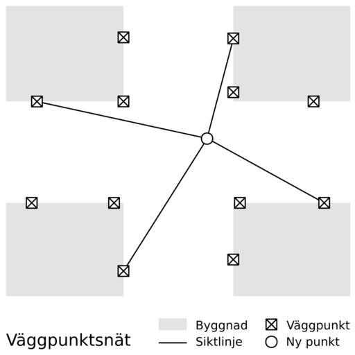 | Keywords: Väggpunktsnät.svg Svenska Väggpunktsnät och en nypunkt Brukspunktsnät består av märkbrickor eller i undantagsfall prismor monterade på husväggar Utan symboler för gjorda mätningar Own 2009-07-15 Johan Gustafsson KJG2007 Survey method diagrams |