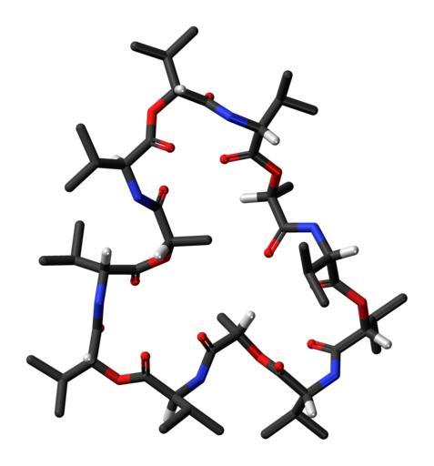 Keywords: Valinomycin 3D skeletal.png Skeletal stick model non-chiral hydrogens omitted of the valinomycin molecule a depsipeptide antibiotic Colour code 505050 Carbon C black<br> F0F0F0 Hydrogen H white<br> F51E1E Oxygen O red<br> 3C50FA Nitrogen N blue<br> 2011-06-15 own DS Visualizer Jynto talk Ball-and-stick version Space-filling version Stick version cc-zero Macrocyclic compounds Ionophores Depsipeptides Images by Jynto |