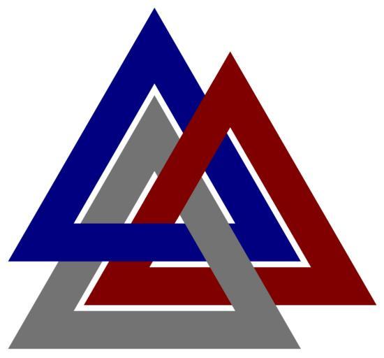 | Keywords: Valknut-Symbol-3linkchain-closed.svg  The Valknut symbol in a form topologically equivalent to a closed three-link-chain See also Image Valknut-Symbol-borromean svg and Image Valknut-Symbol-triquetra svg Note that this form of the Valknut probably did not occur in medieval times as versions of the Valknut equivalent to the Trefoil knot and the Borromean Rings linked above did SVG version of Image Valknut-Symbol-3linkchain-closed png Converted from the following vector PostScript source code <pre> 600 0 translate -1 1 scale uncomment for reflected 15 dup scale /x 3 sqrt mul def 3 setlinewidth 15 11 x moveto 18 0 x rlineto -9 9 x rlineto closepath 5 0 0 setrgbcolor stroke 9 9 x moveto 18 0 x rlineto -9 9 x rlineto closepath 4 4 4 setrgbcolor stroke 9 13 x moveto 18 0 x rlineto -9 9 x rlineto closepath 0 0 5 setrgbcolor stroke 24 20 x moveto -5 5 -5 5 x rlineto 5 0 0 setrgbcolor stroke 21 5 14 5 x moveto 3 -3 x rlineto 4 4 4 setrgbcolor stroke showpage EOF</pre> v fl 2005 PNG and PostScript ; 2006 SVG Design and PostScript code by AnonMoos first SVG conversion made by User Erin Silversmith For alternative depictions of this L6n1 link structure see File Two-representations-of-L6n1-link-as-linked-circles svg <gallery>File Two-representations-of-L6n1-link-as-linked-circles svg</gallery> Valknut Images with PostScript source code Knots and links on transparent background Triangles logo |