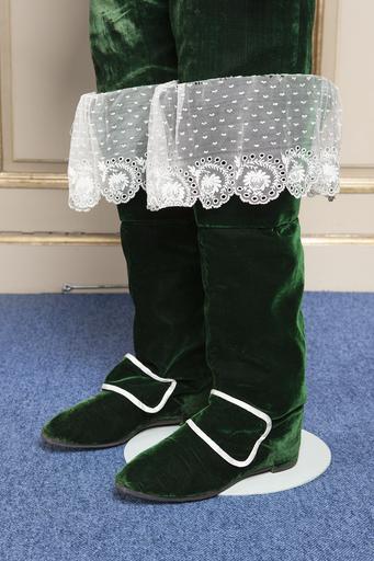 Keywords: Vasaordens stövlar med brysselspets, 1829 - Livrustkammaren - 108335.tif LSH artwork sv Buren av brukspatronen friherre Per Adolf Tamm 1774-1856 <br/>Stövel för höger fot av grön sammet skuren med reseft som i rak sneddad linje går bakom klackens hörn- Skaft som är ihopsytt bak trattformig krage med sömmar fram och bak Sulan randsydd klacken mycket låg med blott en klacklapp som har stickats fast med vit tråd ytterst bak och innert Klacken har 3 pinnhålsstämplar slitna placerade i triangel Sulan har strax före hålfoten 2 kraftiga pinnhålsstämplar liksom en i tåpartiet <br/>Stövlarna är invändigt fodrade med ljusgult getskinn kragen är försedd med styvnad av papp och foder av vit taft I skaftet insydd stropp b 27 mm l 120 mm kypervävnad med ränder i grönt svart och gulrosa Över kragen hänger en vit Bryssel-spets totalbredd 190 mm 150 mm ned Spetsen har en uddad kant med en blomsterkvist som bildar en 70 mm bred rapport Spetsen är ihopsydd baktill <br/>Till stöveln hör sporrläder e2 av grön sammet kantad med vit sidenatlas och fodrad med vit taft 2 tränsar av sammetsremsor är påsydda l 183 mm bredd 80-65 mm original caption Vasaordens stövlar med brysselspets 1829 <br/> Nyckelord Sammet Skor Föremålsbild Vasaorden Stövlar 1829 velvet Färg grön d1 - dräkt - yttermaterial material sammet - morocco leather Färg gul d2 - dräkt - foder material marokäng - lace d6 - dräkt - krage epåletter manschetter material spets - silk Färg vit d4 - dräkt - passpoaler band kantning uppslag material sidenatlas - taffeta Färg vit d2 - dräkt - foder material sidentaft - leather D - DRÄKT material läder size mm 190 krage size mm 330 krage size mm 70 klack size mm 15 klack size mm 540 size mm 83 fot size mm 275 fot LRK Per Adolf Tamm friherre brukspatron Ordensutställningen 1948 Ordensutställningen 2004 Kungl Maj ts Orden basutställning 2005-2016 Stockholms slott place of origin original filename lm_dig22009 64118 inventory number LRK 27524 108335 CC0 Jens Mohr <gallery caption Related objects > File Vasaordensdräkt 1829 - Livrustkammaren - 77772 tif LRK 19455 File Vasaordens häroldsdräkt 1829-tal - Livrustkammaren - 108333 tif LRK 27523 File Rock tillhörande Vasaordensdräkt - Livrustkammaren - 364 tif LRK 19453 </gallery> Order of the Vasa Velvet Footwear Boots Jens Mohr Media contributed by LSH dim-with multiple size templates Media contributed by LSH 2016-05 |