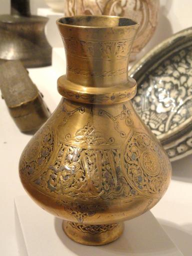 | Keywords: Vase with Inscription Bands and Arabesques, view B, mid 14th century, Mamluk period, Egypt or Syria, incised brass with silver inlay - Sackler Museum - DSC02517.JPG Exhibit in the Sackler Museum Harvard University Cambridge Massachusetts USA The museum permitted photography of this artwork without restriction This artwork is in the public domain because the artist died more than 70 years ago Daderot 2012-11-17 12 23 31 Daderot cc0 cc0 Near Eastern metalwork in the Sackler Museum Mamluk metalwork Metalwork of Egypt |