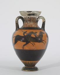 | Keywords: Vatican G 23 Group - Black-figure Pseudo-Panathenaic Amphora - Walters 482105 - Side B.jpg On side A Athena is striding to the left with a spear in her raised left hand and a shield in her right with a large snake a popular shield device on Panathenaic vases of the late Archaic period She is wearing a patterned garment a high-crested helmet and the aegis from which several snake heads clearly emerge Two thin columns crowned by roosters frame the scene The reverse shows two young jockeys in high gallop in the heat of the race Both boys are nude and ride without saddles or stirrups guiding the horse with their reins The rider in the back is using a whip in his raised right hand to gain some ground on his opponent The focus is clearly on the rider on the left whose horse occupies the composition's foreground its head partially obscuring the other rider The prominence of the horse and rider captured at a decisive moment in the race may signal the contest's victor The amphora lacks the prize inscription on the front that is characteristic of small-scale copies created for trade and as commemorative souvenirs of the Panathenaic prize amphoras see Bentz 1998 19-22 Dorothy Hill noted that the piece is stylistically and thematically close to the work of the Eucharides Painter who painted at least three full-scale Panathenaic prize amphoras depicting two riders competing Maul-Mandelartz 1990 105 ca 500 480 BC late Archaic terracotta cm 41 26 4 accession number 48 2105 39632 St Audries Collection date and mode of acquisition unknown Sale Sotheby's February 23 1920 no 230 William Randolph Hearst San Simeon date and mode of acquisition unknown William Randolph Hearst Estate Sale May 1958 Walters Art Museum 1958 by purchase Museum purchase 1958 Heroes Mortals and Myths in Ancient Greece The Walters Art Museum Baltimore; Frist Center for the Visual Arts Nashville; San Diego Museum Of Art San Diego; Alexander S Onassis Public Benefit Foundation USA New York 2009-2011 place of origin Attica Greece Walters Art Museum license Ancient Greek black-figure pottery in the Walters Art Museum Group of Vatican G 23 Pseudo-Panathenaic amphoras Media contributed by the Walters Art Museum needs category review Media contributed by the Walters Art Museum needs artist update |