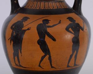 | Keywords: Vatican G 23 Group - Black-figure Pseudo-Panathenaic Amphora with Discus Thrower - Walters 482109 - Side B Detail.jpg Panathenaic amphorae were prizes given to victors at the Panathenaic all-Athens festival the great state festival of Athens It was held every four years much like the Olympic games The prize amphorae were quite large and contained olive oil the most valuable part of the award Smaller versions such as this one were produced as commemorative objects Each Panathenaic vase depicts a striding armed Athena on the front As the city's patron goddess in whose honor the festival was given she was thought to preside over the games The back shows the particular event for which the prize was given Here the contest is discus-throwing and a competitor appears with his trainer holding a staff and another athlete ca 500 485 BC Classical terracotta cm 38 1 23 5 accession number 48 2109 32454 William Randolph Hearst San Simeon date and mode of acquisition unknown William Randolph Hearst Estate Sale May 1958 no 5494 Walters Art Museum 1958 by purchase Museum purchase 1958 Goddess and Polis The Panathenaic Festival in Ancient Athens Hood Museum of Art Hanover; Tampa Museum of Art Tampa; Virginia Museum of Fine Arts Richmond; Princeton University Art Museum Princeton 1992-1993 Heroes Mortals and Myths in Ancient Greece The Walters Art Museum Baltimore; Frist Center for the Visual Arts Nashville; San Diego Museum Of Art San Diego; Alexander S Onassis Public Benefit Foundation USA New York 2009-2011 place of origin Athens Greece Walters Art Museum license Ancient Greek black-figure pottery in the Walters Art Museum Group of Vatican G 23 Pseudo-Panathenaic amphoras Athletes in ancient Greek pottery Ancient discus throw Media contributed by the Walters Art Museum needs artist update |