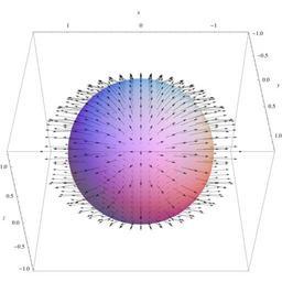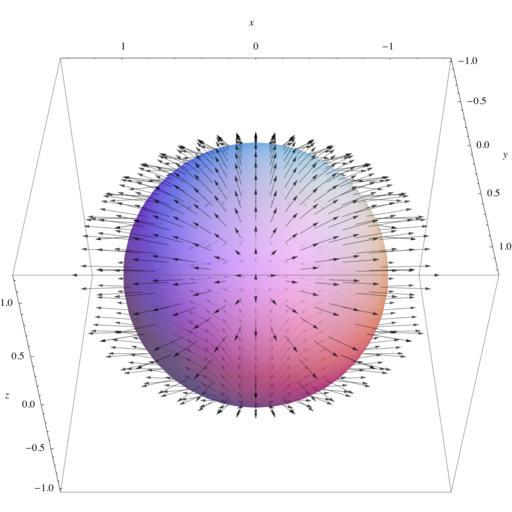 | Keywords: Vector Field on a Sphere.png en The vector field represented by <math> \mathbf f 2x \hat \mathbf x + y 2 \hat \mathbf y + z 2 \hat \mathbf z </math> plotted over the unit sphere Vectos have been uniformly scaled down to 0 2 times their original length for aesthetics Originally created as an image for the example problem on the divergence theorem page to replace the less relevant image here 2011-11-05 own Glosser ca Mathematica 7 0 Source <pre> scaling 0 2; stepSize 1/10; makeVectorsdata_ f_ Map Arrowheads0 01 Arrow + scaling f data upperHemix_ y_ Sqrt1 - x 2 - y 2 lowerHemix_ y_ -Sqrt1 - x 2 - y 2 fx_ y_ z_ 2 x y 2 z 2 upperPoints FlattenTable x y upperHemix y x -1 1 stepSize y -Sqrt1 - x 2 Sqrt1 - x 2 stepSize 1 ; lowerPoints FlattenTable x y lowerHemix y x -1 1 stepSize y -Sqrt1 - x 2 Sqrt1 - x 2 stepSize 1; upperVectors makeVectorsupperPoints f; lowerVectors makeVectorslowerPoints f; Graphics3D Opacity0 8 Sphere Opacity0 7 upperVectors~Join~lowerVectors ViewPoint -> Back Top Axes -> True AxesLabel -> x y z LabelStyle -> DirectiveLarge ImageSize -> 1200 1200 </pre> Uploaded with UploadWizard Vector fields |