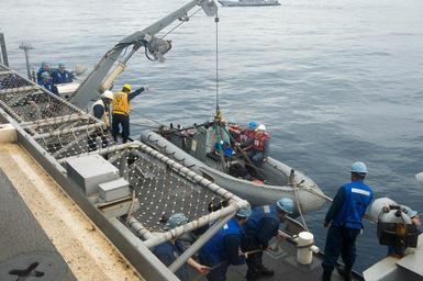 Keywords: Vehicle and supplies on-load 140203-N-IC565-113.jpg en Sailors lower the ridged-hull inflatable boat in support of a vehicle and supplies on-load aboard the Austin-class amphibious transport dock ship USS Denver LPD 9 Denver is assigned to the Bonhomme Richard Amphibious Ready Group and is conducting operations in the U S 7th Fleet area of responsibility U S Navy photo by Mass Communication Specialist 3rd Class Bradley J Gee/Released 2014-02-03 Petty Officer 3rd Class Bradley Gee https //www dvidshub net/image/1161401 140203-N-IC565-113 2014-02-04 19 26 OKINAWA JP PD-USGov-Military-Navy USS Denver LPD-9 Images from DoD uploaded by Fæ |