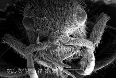 Keywords: Velvet ant head anterior -- SEM photo.jpg en At a low magnification of only 23X this scanning electron micrograph SEM showed the head region from an anterior view of a female velvet ant Dasymutilla sp Note the two laterally positioned eyes the anterior pair of antennae each attached to the head by a rounded scape the numerous hairs or setae adorning almost all exterior surfaces and the jointed legs from which the insects Phylum Arthropoda is derived i e Arthro jointed and poda leg CDC PHIL ID 9897 Carr Janice PD-USGov Vespoidea heads Unidentified Mutillidae |