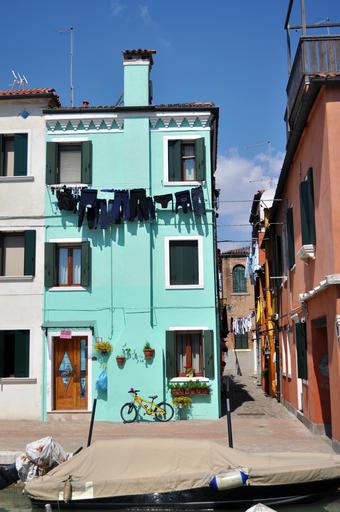 Keywords: venice burano bicycle houses glimpse bicycles italy borgo window boat cloths linen sky