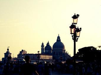 Keywords: venice italy lamp posts lights people crowd pedestrians buildings water architecture city sunset sky
